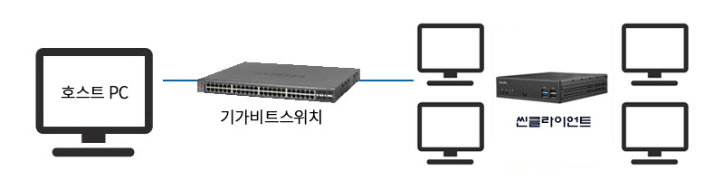 호스트 PC는 Windows 또는 Linux로 운영하며 클라이언트 사용자 컴퓨터의 네트워크 부팅을 위한 OS 부팅파일 전송 및 부팅 후 읽기 및 쓰기를 위한 디스크 공간을 제공합니다.