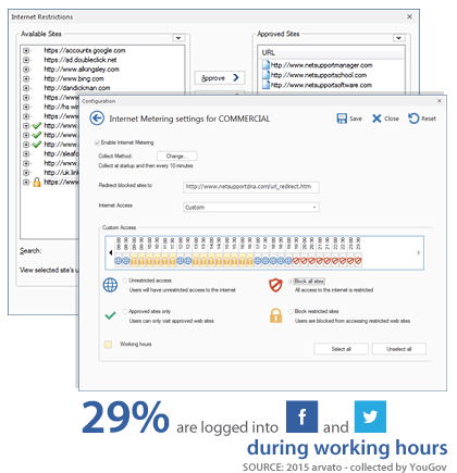 인터넷 계량 모듈은 방문한 각 URL의 시작 및 종료 시간과 페이지에서 소비된 활성 시간을 포함하여 사용자가 각 PC에서 수행 한 모든 인터넷 활동에 대한 자세한 요약을 제공합니다. 결과는 특정 장치에서의 활동 또는 사용자가 작업 한 위치에 관계없이 검토 할 수 있습니다. 당연히 효과적인 정책을 지원하는 열쇠는 효과적인 통제를 제공하는 것입니다. NetSupport DNA를 사용하면 인터넷 사용을 완벽하게 관리 할 수 ​​있으며 승인되고 제한된 URL 및 / 또는 하위 URL 목록을 중앙에서 적용 할 수 있습니다. NetSupport DNA를 적용하면 모든 웹 사이트에 제한 없이 액세스 할 수 있으며, 회사가 승인 한 특정 웹 사이트에 대한 액세스가 제한되거나 부적절하다고 표시된 특정 사이트에 대한 액세스를 차단할 수 있습니다.